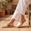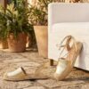 Metallic gold finish with a classic jute sole and adjustable ankle ties. 🌟 The closed-toe espadrille design adds a touch of charm to any outfit.