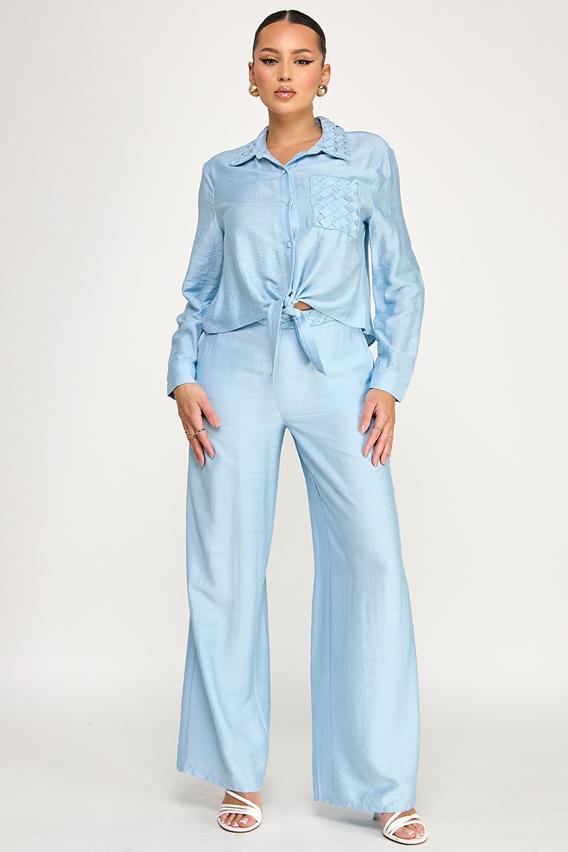 Be the first to review “Long Sleeve Button Down Top And Pants Set With Basket Weave Detail” Cancel reply