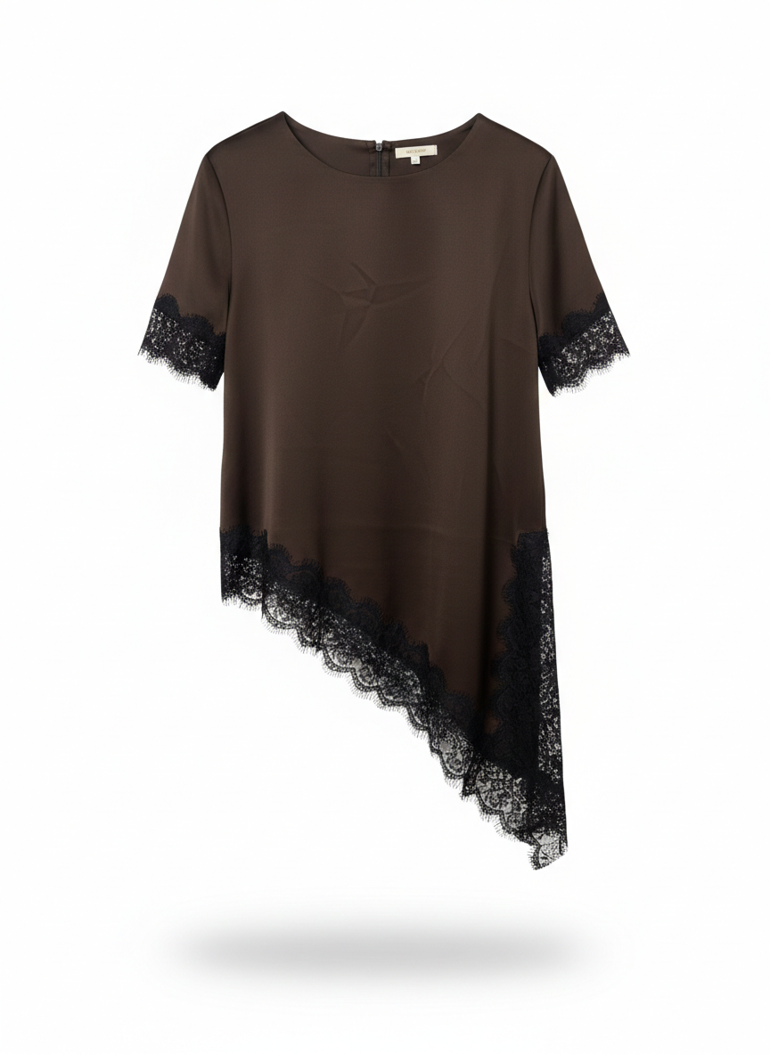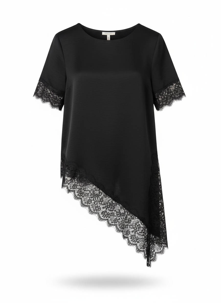 Premium Made in Italy Satin Blouse for Women – Elegant Silk-Feel Top with Luxury Lace Trim – Chic Asymmetric Hem Satin Shirt for Party & Office.